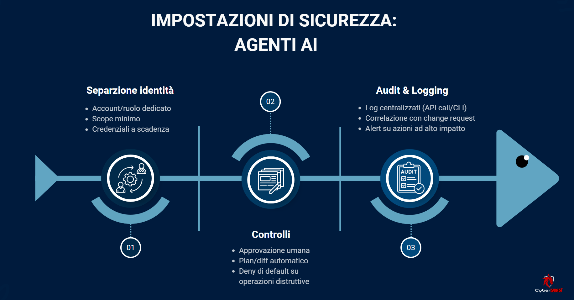 - Logging a prova di audit: comandi eseguiti, API call, identità, contesto, timestamp, correlazione con ticket/change request.