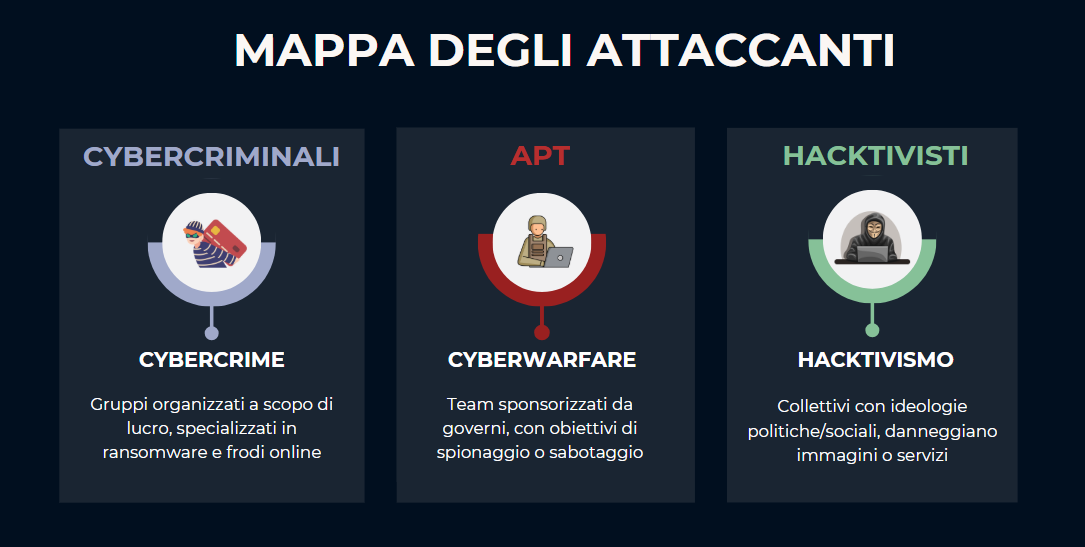 Gli attori degli attacchi informatici, in questi anni, non sono semplicemente “hacker” isolati. Operano come vere e proprie organizzazioni criminali con ruoli ben definiti. Gli attaccanti possono essere riassunti in 3 macro-categorie, ciascuna con tattiche e obiettivi distinti.