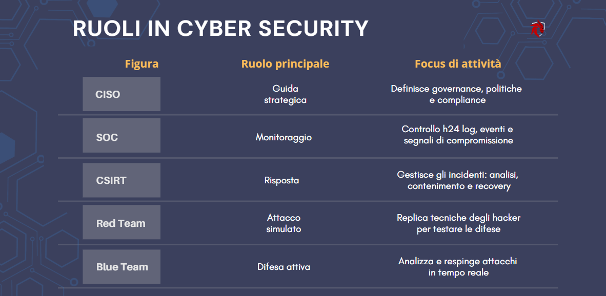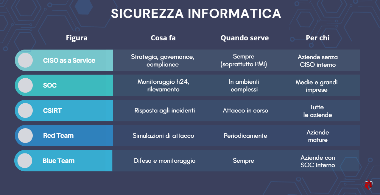 Il quadro si completa con la presenza di figure quali Blue Team e Purple Team, che si occupano di difesa e collaborazione sinergica.